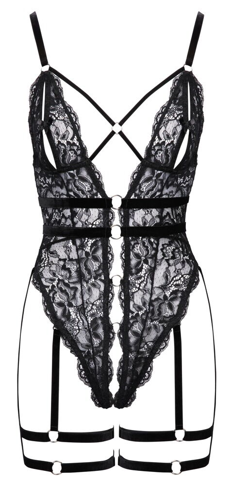 Body negro sin entrepierna de Cottelli LINGERIE con tirantes de liga y arneses en los muslos (todos desmontables). Body de suave encaje floral elástico negro. Completamente abierto por delante, los anillos decorativos plateados mantienen todo firmemente unido. También seductoramente abierto en la entrepierna. Copas de encaje con pequeños cierres de gancho para la apertura y elegantes tirantes y anilla. Tirantes ajustables de terciopelo elástico en la cintura. Los tirantes y los muslos también son de terciopelo elástico y se pueden ajustar. Las joyas del muslo también se pueden quitar por completo junto con los tirantes.