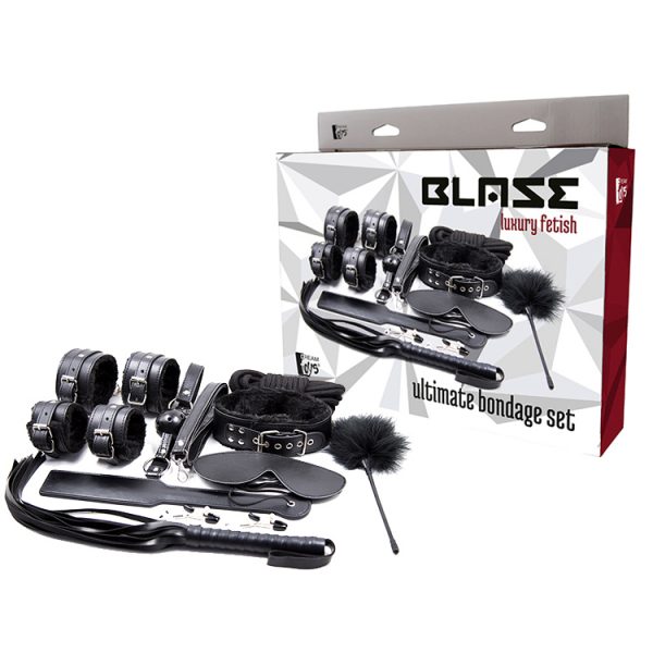 Este set de bondage Blaze es el conjunto definitivo para principiantes, que contiene 10 elementos: esposas de muñeca, esposas de tobillo, máscara, paleta, látigo, pluma, collar con correa, mordaza de bola, pinzas para pezones y cuerda. Las restricciones de muñeca y tobillo y el collar están forrados con un suave pelo artificial para un aspecto lujoso y una comodidad óptima. El tamaño se puede ajustar con los cierres de hebilla de metal. La correa de aspecto de cuero se puede acoplar al collar con un mosquetón y un anillo en D.